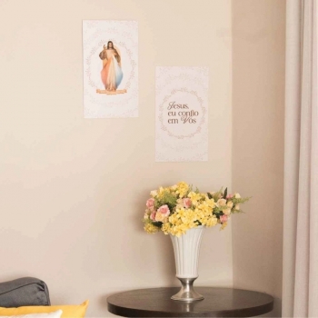 Apresentamos a Tela Jesus Misericordioso, feito em PVC expandido, na cor branca. Vem com duas telas com adesivo na parte de trás, para serem coladas na parede.