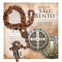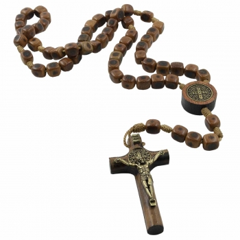 Este Terço São Bento é feito em madeira na cor marrom, com a cruz e a Medalha de São Bento em metal, e contas quadradas de 9mm.